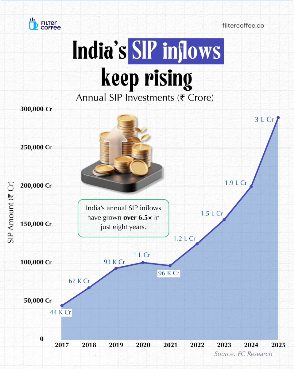 This is the quiet revolution that doesn’t get enough airtime. Household savings are being steadily financialised, moving away from real estate and gold and into market-linked instruments. Estimates suggest roughly ₹5 trillion a year now flows into equities via this route (SIP + other investments). Even in a year when gold performed exceptionally well - traditionally a competitor for household savings - equity flows held up.