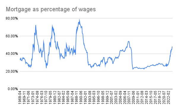 I know I am excluding cash buyers in this calculation and they are a fairly big lot - between a quarter and a third. I am reluctantly comfortable with excluding them in this analysis, because (a) I think price-setting is still happening through mortgage buyers as they form the super majority and (b) thinking of prices in isolation is harder as a thought exercise and easier when anchored to something else - like wages.