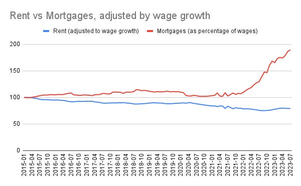 The natural next question is - haven’t rents increased too? Rents have also increased. ONS data on rent tells us that rents have increased some 20-23% over the past 8 years depending on where you live, but that is overshadowed by wage increases, which have increased from £24,769 to £34,476 in recent data, some 40% during the same period. In fact the net effect of putting rents and mortgages, both indexed to wages, is rather stark: