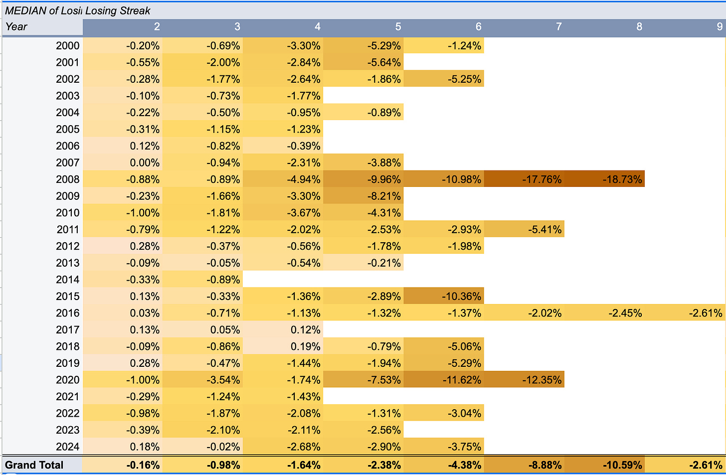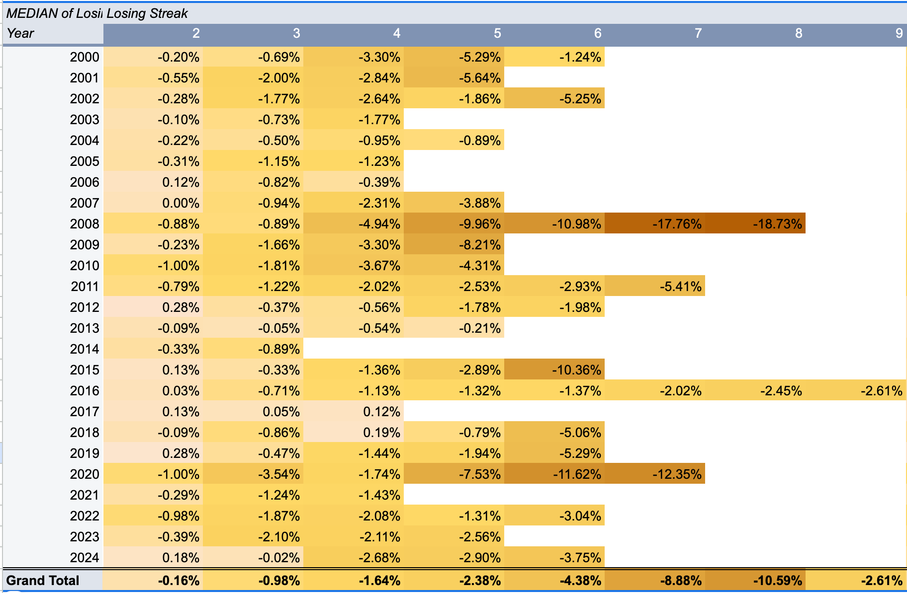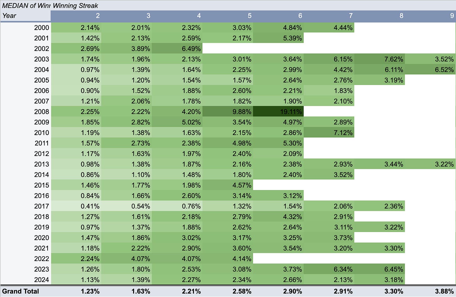 Let’s now turn our heads to the median returns during streaks. Very intuitively longer the streak higher the returns, with very few inversions (like in 2003, where the 9 day streak produced lower median returns than the 7 day or the 8 day streaks). What’s interesting is that very long winning streaks are not a given - there are 3 years with a maximum of only 5 day winning streaks. 9 day winning streaks are extremely rare.