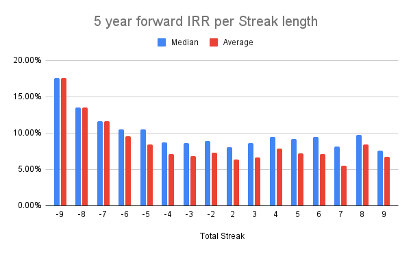 Very similar trends for losing streaks too - longer the streak, the worse the median returns from the streak.