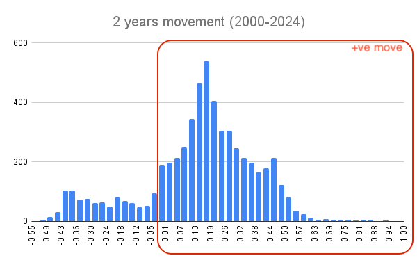 Take 2 years of returns and the left hand side is further diminished. The median returns are 17.66%.