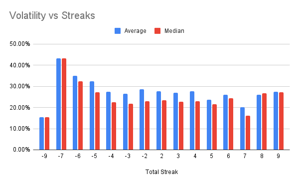 Somewhat interestingly, the length of the winning streaks doesn’t affect volatility that much, but as the losing streak gets longer, volatility tends to spike up, a lot. This makes intuitive sense, the reason for long losing streaks is likely extreme fear, which should correlate with high levels of volatility.