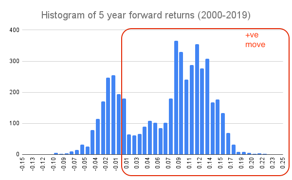 One more thing about streaks. I tried to analyse the 5 year forward return of the index at the end of each streak, imagining that there might be a secular pattern. While I didn’t find any discernible pattern on the winning streak side, it is clear that forward returns tend to be greater when the index is nearing its longest losing streaks. If you are looking for the perfect time to enter the markets, it might be at the end of long losing streaks (5 or more days) - there have been 45 such instances since the turn of the century. However, that’s no guarantee to a positive return too, as 6 of those 45 occasions resulted in a net negative return 5 years on. Talk about market timing being difficult!