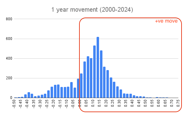 Let’s zoom out further and look at 1 year returns of the index. Vast majority of the returns are now positive, with the median being 10.21%.