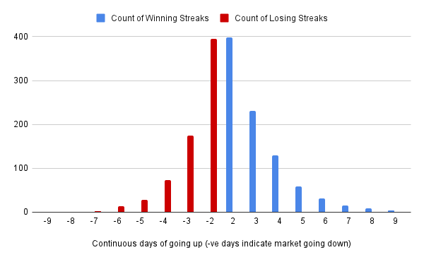 Again, we see that the index spends longer streaks more often winning than losing. However, I was surprised that the longest streaks in either directions is just shy of two trading weeks. So, if the index goes up 7-9 days, you can kind of sort of1 expect it to go down the following day and vice versa. This could come in as a handy tactic.