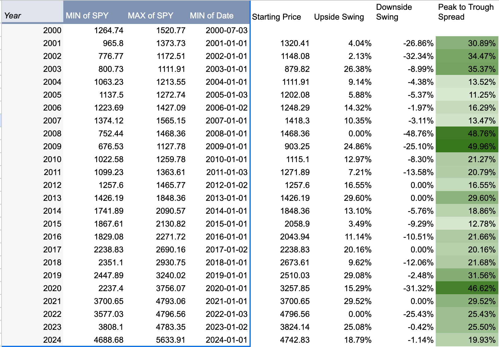 The analysis is based on closing prices of S&P 500 from 3rd Jan 2000 to 12th July 2024, collected through Google Sheets’s GoogleFinance function. Spot checks tell me that it is an accurate source of data. With about 6269 closing prices, and about 25 derivative columns, the data used comprises of over ~100K data points. Since this is looking at pure index data, dividends are ignored. For cases where long term metrics are concerned, users are advised to factor in dividends into any mental notes they make.