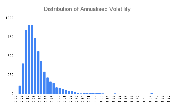 Volatility of the index has a median of 22.56% and follows an expected distribution - mostly being range-bound with a long tail.