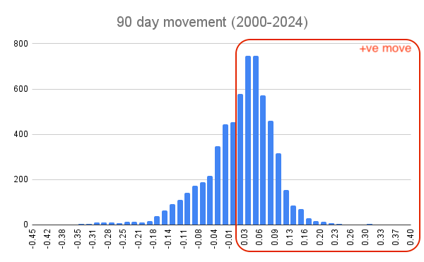 Let’s zoom out a little. Across 90 day periods, the graph is favouring being the positive significantly. The median return is 2.92%.