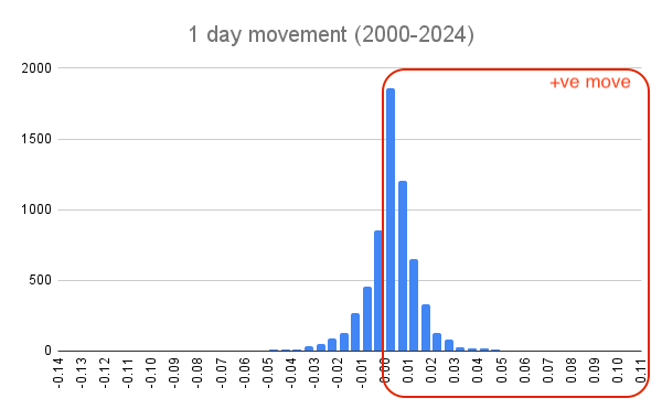 Let’s start with the unsurprising bits. Vast majority of the days, the index moves very little, between -0.15% to about 0.15%, with the median being 0.03%. The graph is heavier on the right side of the 0 line than it is on the left side and this makes total sense - after all the index mostly goes up - even though the index spends a lot of days declining, it spends more days advancing.
