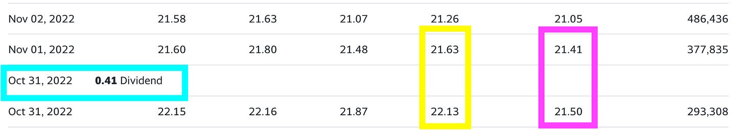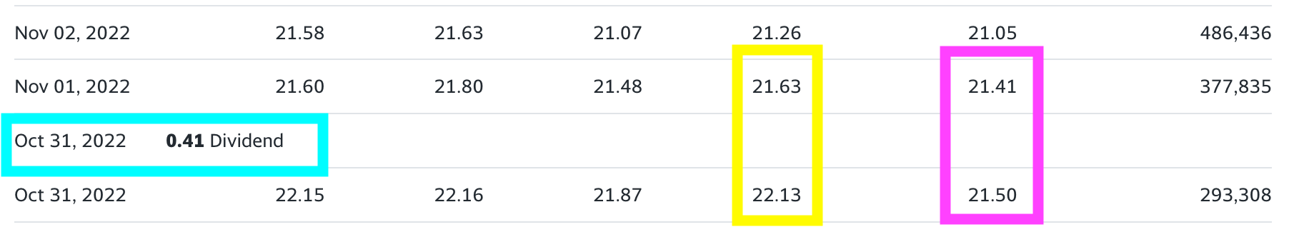 How does this work in practice? Look at this data from Oct 2022, when a dividend was paid out by Brickworks. The closing price dropped a solid A$0.50 (marked in yellow) on that day. However, A$0.41 is recognised as the dividend (marked in aqua) between the previous close and the new close. So, the adjusted price declines only by A$0.09 (in the pink box)