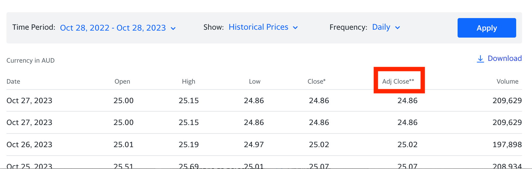 In this tab, there is a column called Adjusted Close. Yahoo describes it as “**Adjusted close price adjusted for splits and dividend and/or capital gain distributions.” - precisely what we want. You can adjust the dates and get the historical adjusted close price of a stock from any date provided on the UI.