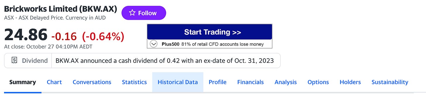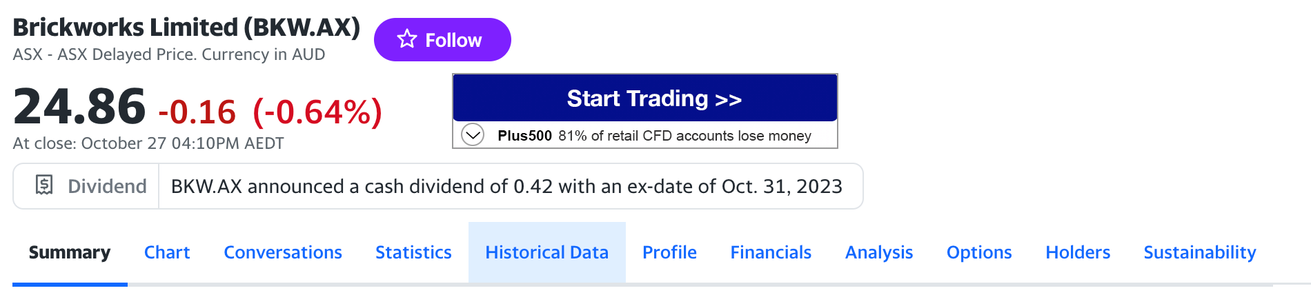 (1/2) Yahoo Finance has a feature where they provide historical price adjusted for stock splits, dividends etc. Let’s take a look at an example. Let’s review our good friend Brickworks. You will find Historical Data tab in the Yahoo page for this stock.