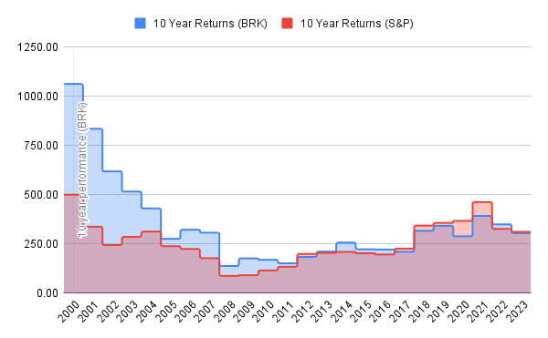 Perhaps we need to zoom into the most recent years. From the turn of the millennium, a 10 year period has only produced 7 wins for S&P 500 vs 17 wins for Berkshire. When Berkshire outperforms, it stands out by a margin, but when S&P 500 does so, it barely clears the Berkshire hurdle.