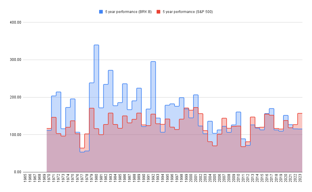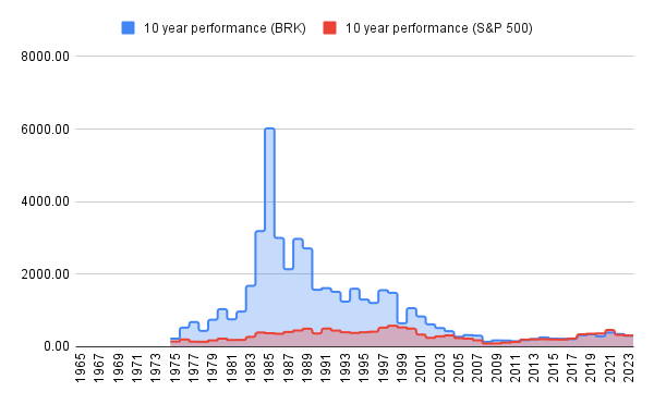 On a 10 year basis, S&P 500 doesn’t seem to compete for most of Berkshire’s history.