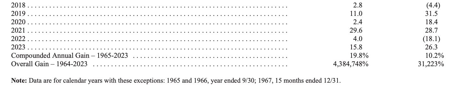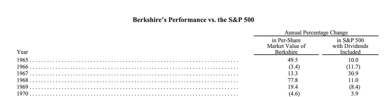 Every year, Berkshire publishes a comparison of Berkshire’s performance vs the S&P 500 in a table that looks like: