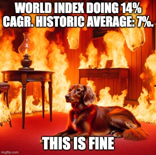 So, realistically, we shouldn’t expect a global tracker to compound much beyond 7% nominal / 4.5% real over time. Yet, here we are with far higher returns in the recent three-year stretch. What’s driving this? And what comes next?