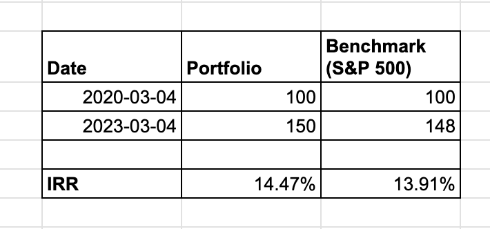 That said, IRR does not compare risk, so while you will be able to compare bitcoin to treasuries and get a feel of comparative returns, you should likely do a proper risk adjusted return calculation to get alpha (which is the appropriate measure of risk adjusted returns between two investments) - I am not going to go into that for this post. Suffice to say that so long as you are comparing apples to apples, such as when comparing a portfolio to its benchmark, IRR comparison is well and good.