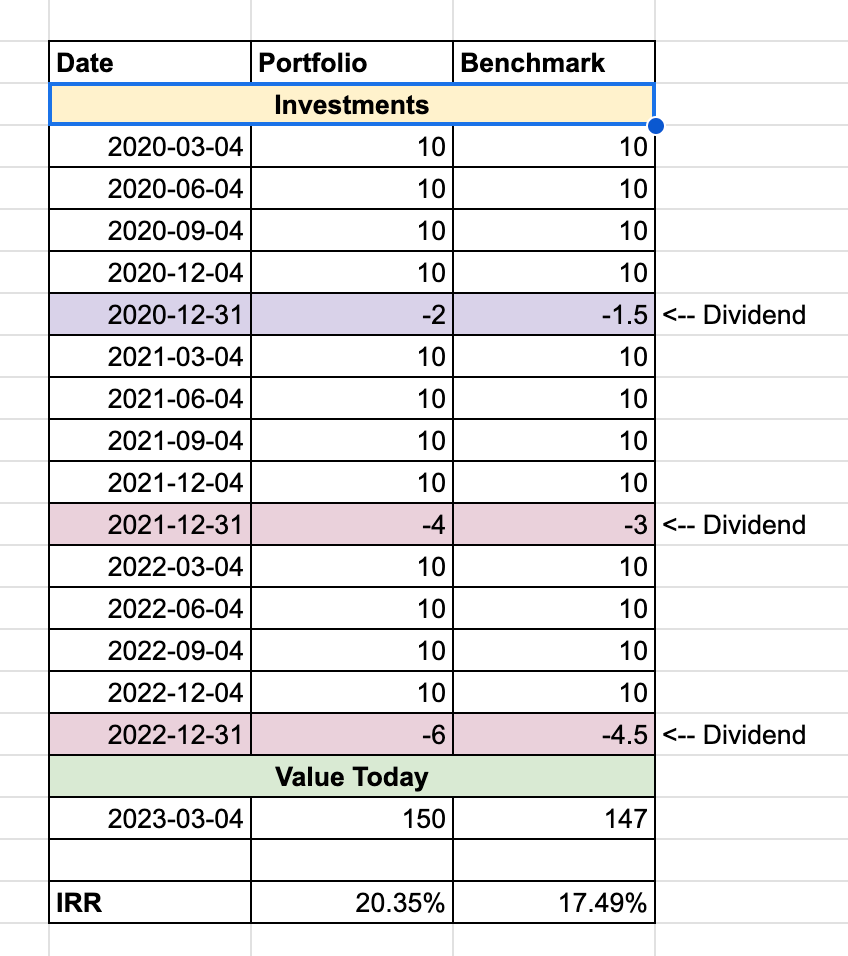 Even this scenario is super simple. In real life, we also have dividends being sent to us, which makes our tables look a bit like what’s presented below and thankfully, the XIRR formula will continue to produce the right rate of returns.