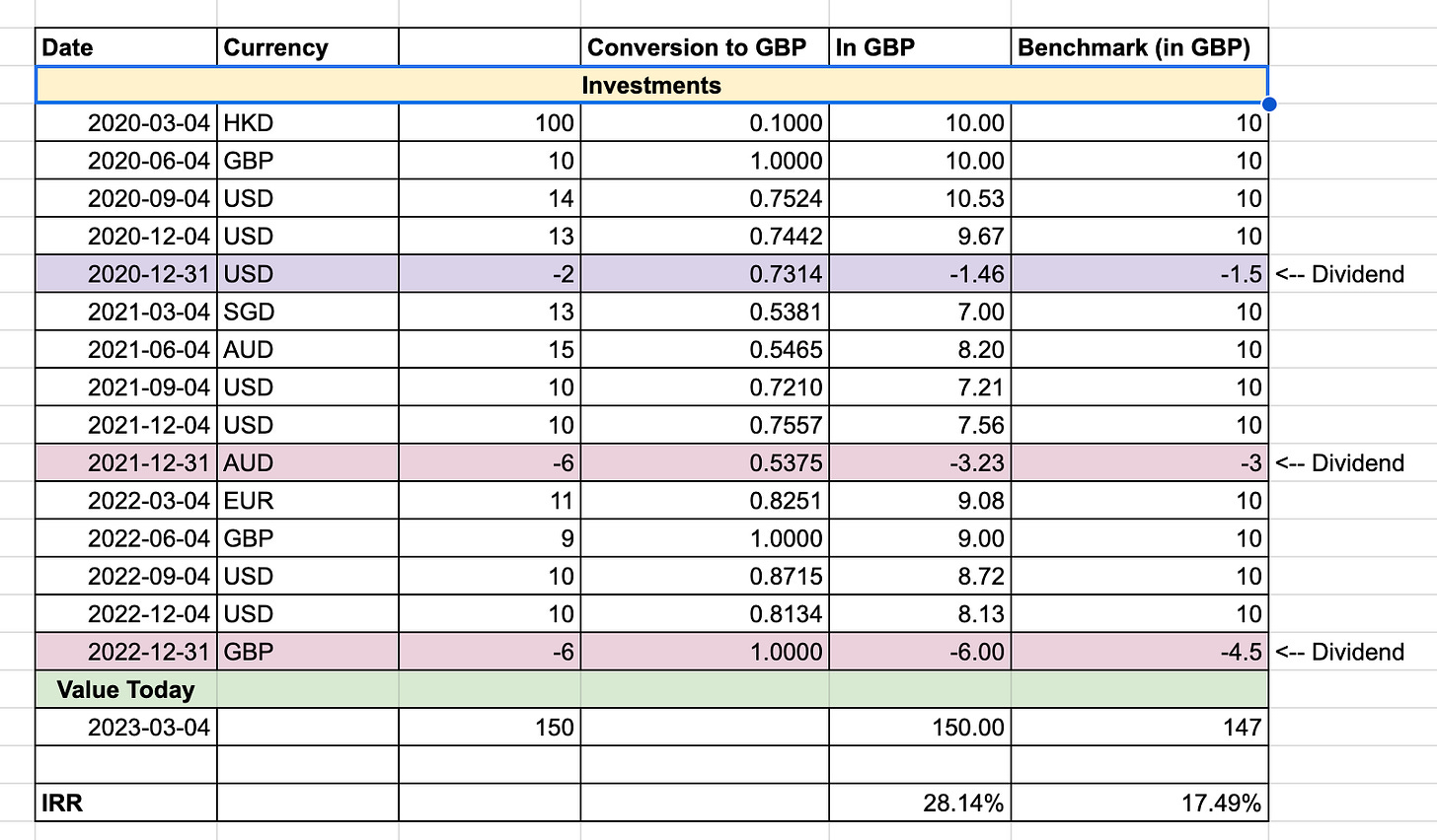 So far so good. What about investments in multiple currencies? You need to pick a single currency to convert all your cashflows into, and then use that currency for all calculations. In general, it makes sense to pick the currency of your benchmark to convert into, but you can obviously choose something else, and then convert all transactions into that currency. All currency conversions should be done on the rate prevalent on the date of the transactions.