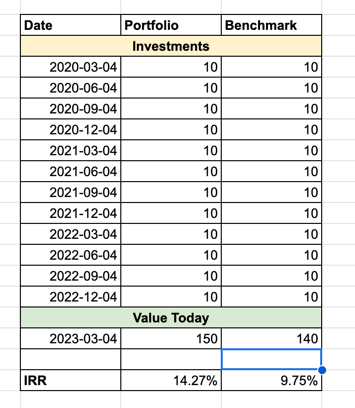 You can do this yourself at home - fill up the inputs (dates and amounts) and use the XIRR formula (in Google Sheets or Excel) and you are set.