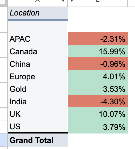 In terms of other nuances, India, APAC and China are all drags on the portfolio at the moment, while Canada and UK are really pulling the returns forward. (Chinese positions have had a good rally the past few weeks - before that, things were a lot worse in that basket)
