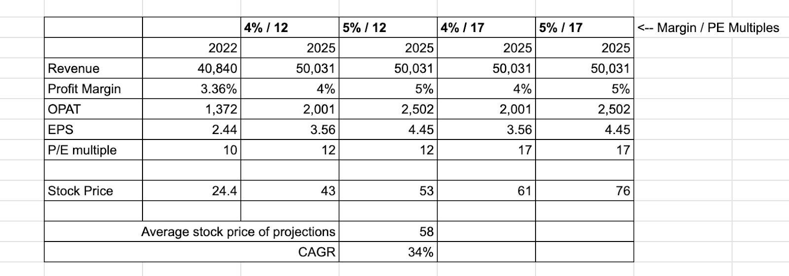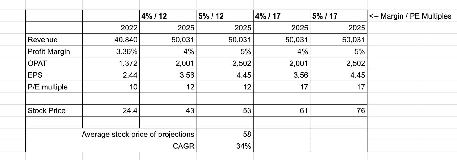 Another way to look at this opportunity is to play this purely on the cost structure improvements and leave out the FME/FMS spinout altogether. Looking 3 years out, here are a few projections on the company’s metrics. I have reduced revenue growth to a modest 7% (vs 8.9% today) for this exercise, and play on both profit margins and PE multiple. 5% profit margin, for instance, is the 10% running average for this business, while 17x PE is at the lower range for the business from before 2022. So, these expectations aren’t outlandish, if the business indeed turns a corner.
