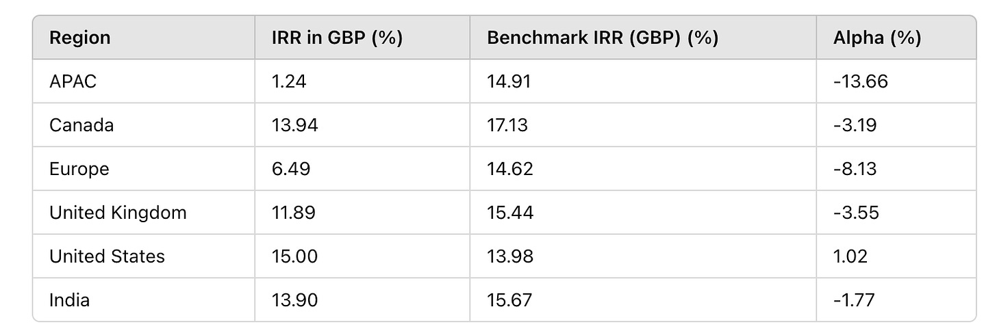 Breaking down by region, underperformance is widespread outside the US. APAC has imploded, Europe has struggled, and while Canada, the UK, and India have also underperformed, their results are more tolerable: