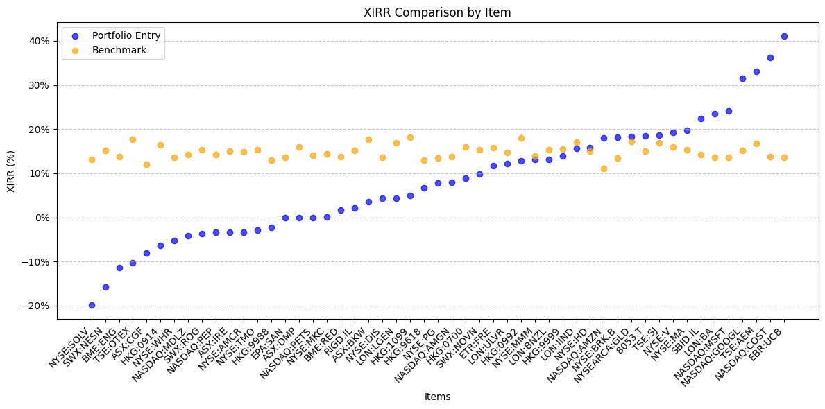 One of my ongoing frustrations has been the inability to dissect this underperformance effectively. Calculating XIRR in Google Sheets is cumbersome—you need to aggregate all cashflows (buys, sells, dividends, current prices, etc.), align them with their dates, and then calculate results. While I had built basic functionality for the portfolio as a whole and for individual tickers, deeper analysis, like slicing by region, required manually recreating calculations.