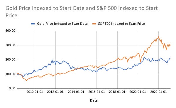 These comparisons with S&P 500 are without dividends included. With the dividends included, S&P outshines gold, but that doesn’t take away from the core argument I am making here.