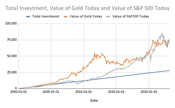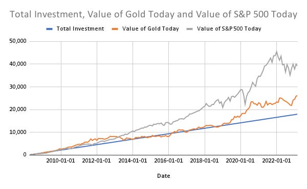 Similarly, on a systematic investment basis, over the past 22+ years, gold and S&P 500 are almost neck and neck. Once dividends are included, S&P will edge ahead by some margin, but again, it is clear that Gold has very good hedging properties and must be considered as a valuable option in that direction.