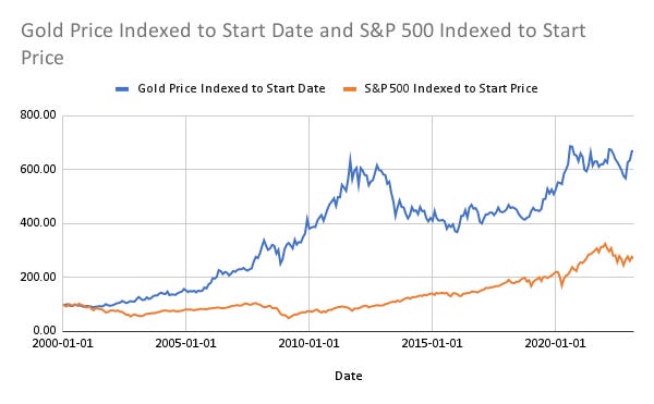 Gold in fact has been outperforming S&P 500 over the past 20 years. In fact, large part of its outperformance came between 2005 and 2013 after which gold has been range bound.