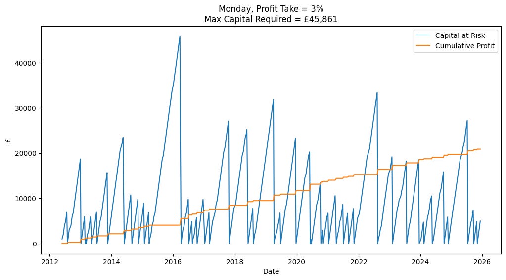 To make this more than armchair theory, I ran this strategy across thirteen years of daily price data. Different weekdays were tested. Different profit thresholds were tested, from 3 percent to 10 percent. Transaction costs were explicitly included. Whole units only. No flattering assumptions. Returns were measured not just in absolute pounds, but in CAGR terms using actual cash flows, so that faster capital recycling was rewarded appropriately.