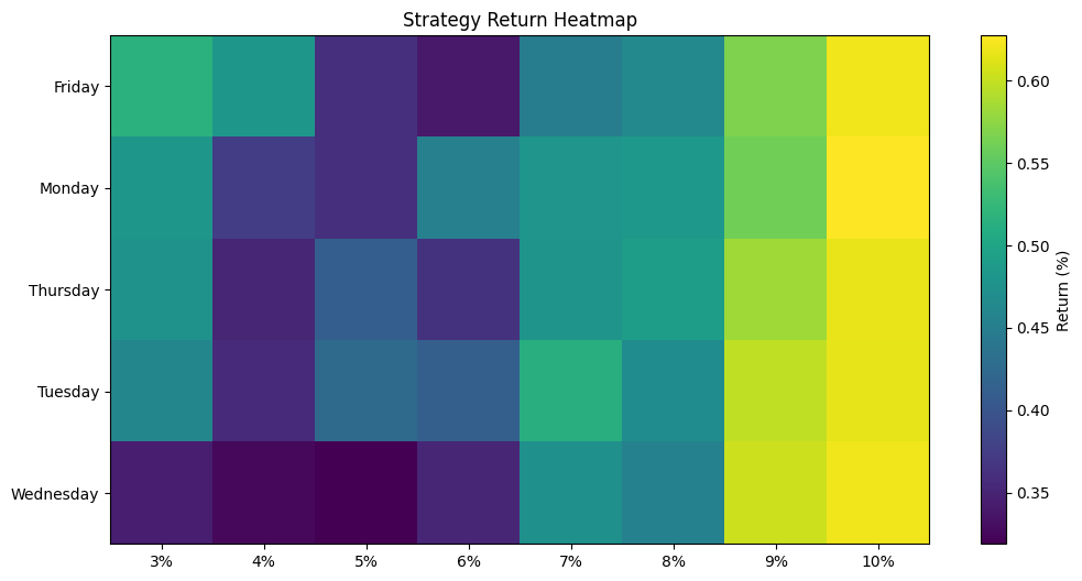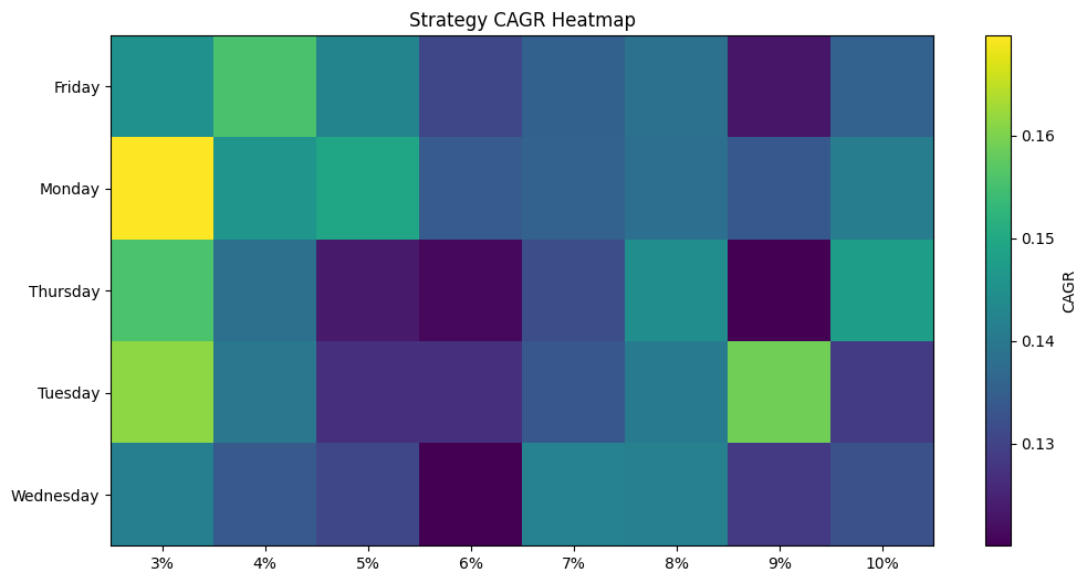 Second, cadence matters. The day of the week is not irrelevant. Some days consistently perform better than others for certain thresholds. This is not magic, and it is not guaranteed to persist, but it does suggest that even simple behavioural and liquidity patterns can leave fingerprints in price data. That said, as you can see above, while there is variation ins returns, almost all of the combinations result in at least 11% CAGR return - which is, to put it mildly, not bad.