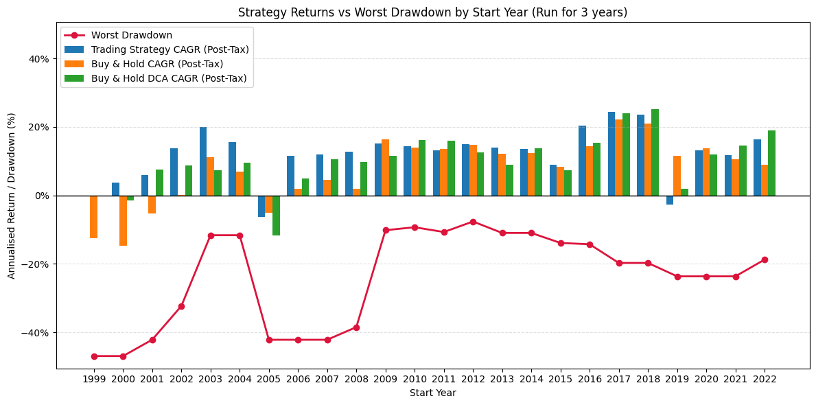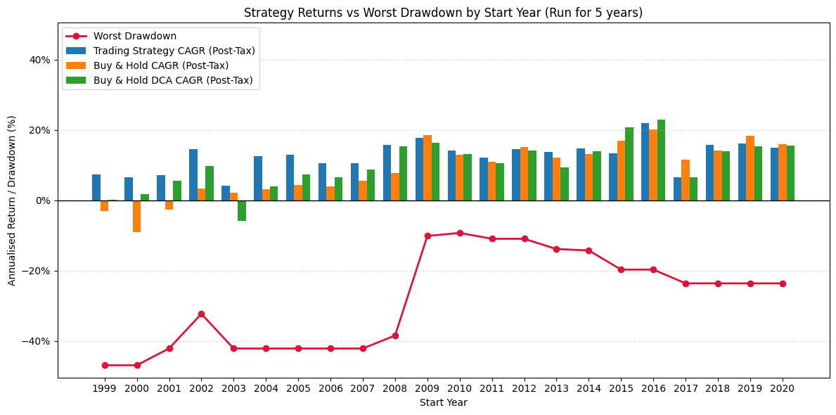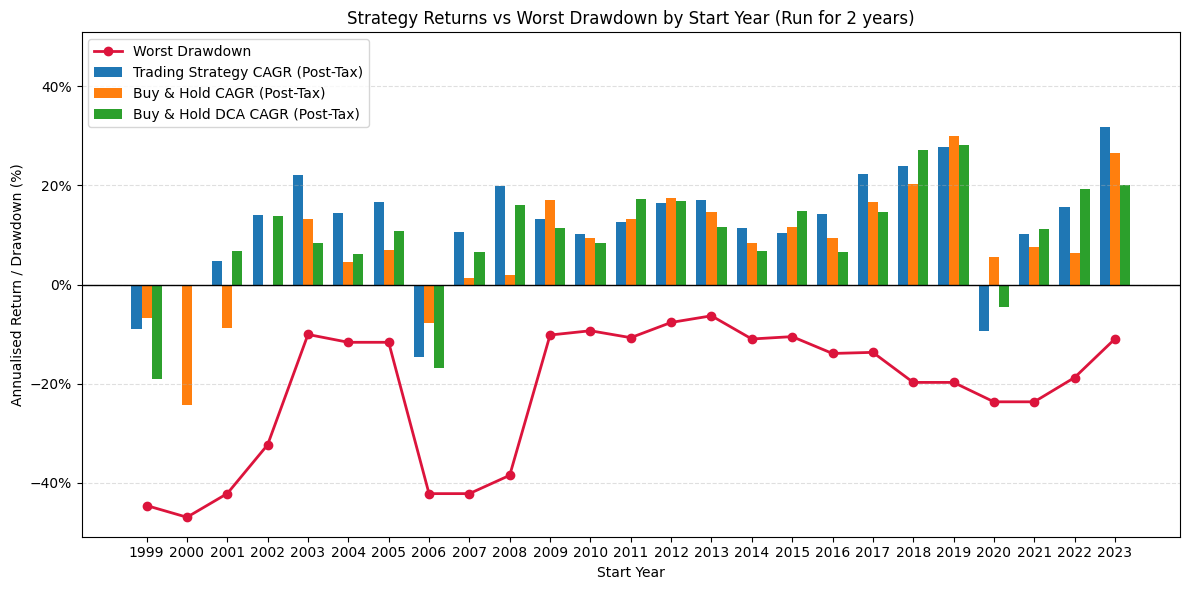 Depending on when you start, a two-year window can produce outright losses or significant underperformance versus simpler strategies. More importantly, the drawdowns can be severe. This is where the emotional cost of the strategy becomes most apparent. Being materially down for extended periods is not for the faint-hearted.