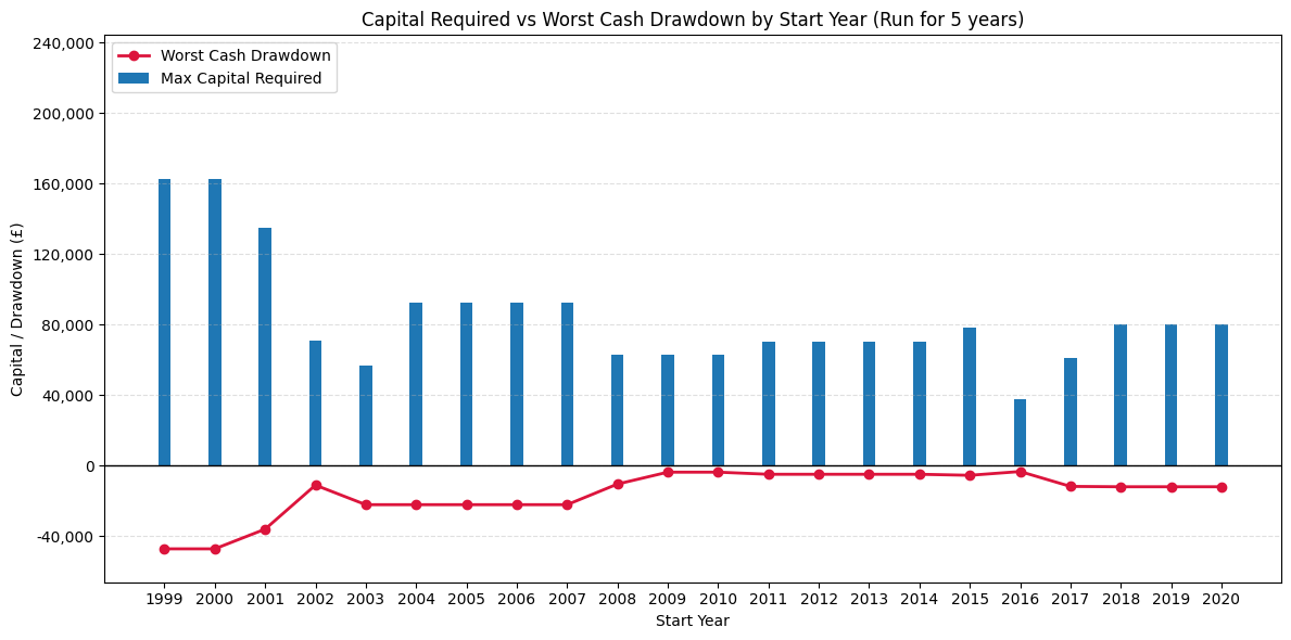 At five years, the picture finally stabilises. Losing periods disappear in this sample, and the strategy becomes more robust. However, the capital requirements and worst drawdowns remain substantial.