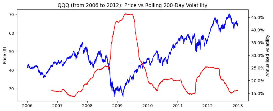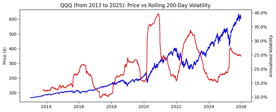 Then came the era QQQ is now famous for. From 2012 onwards, it went on a staggering bull run, rising roughly sixfold over thirteen years. Equally striking is what did not happen: volatility never returned anywhere near the peaks seen during the dot-com crash or the GFC.