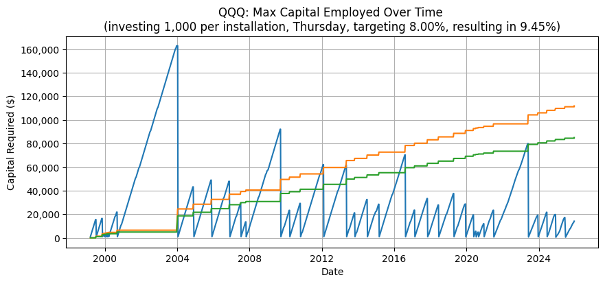 The maximum capital required peaks at around 160,000, off of a $1,000 investment each week! That represents more than three years of continuous weekly buying without ever hitting the profit threshold required to trigger a sale.