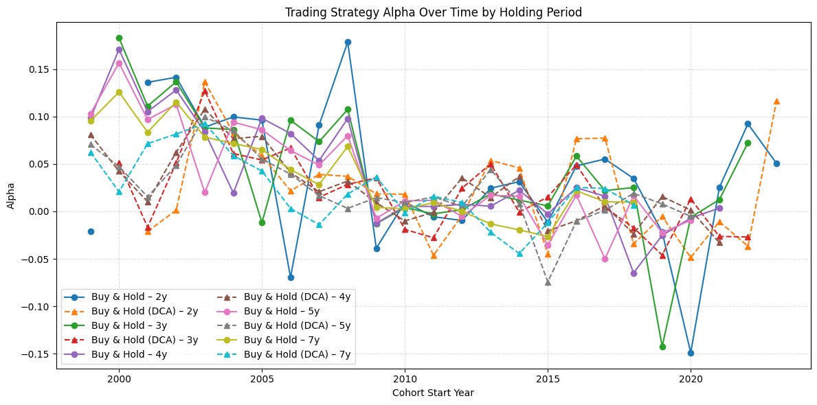 To make this explicit, it helps to look at performance across a wide range of holding periods.