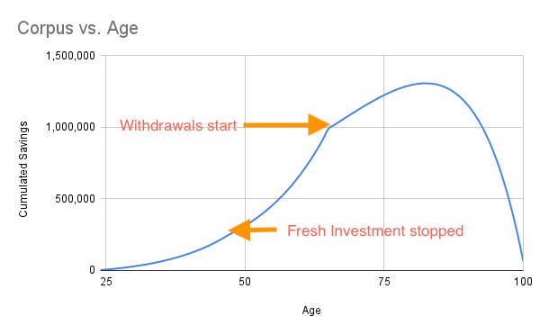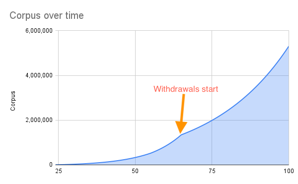 The reason for ending up with so much in corpus at age 100 is that the investor is only withdrawing 4% of the outstanding corpus, but the corpus itself is growing at 8%, so it grows in perpetuity - true magic of compounding!