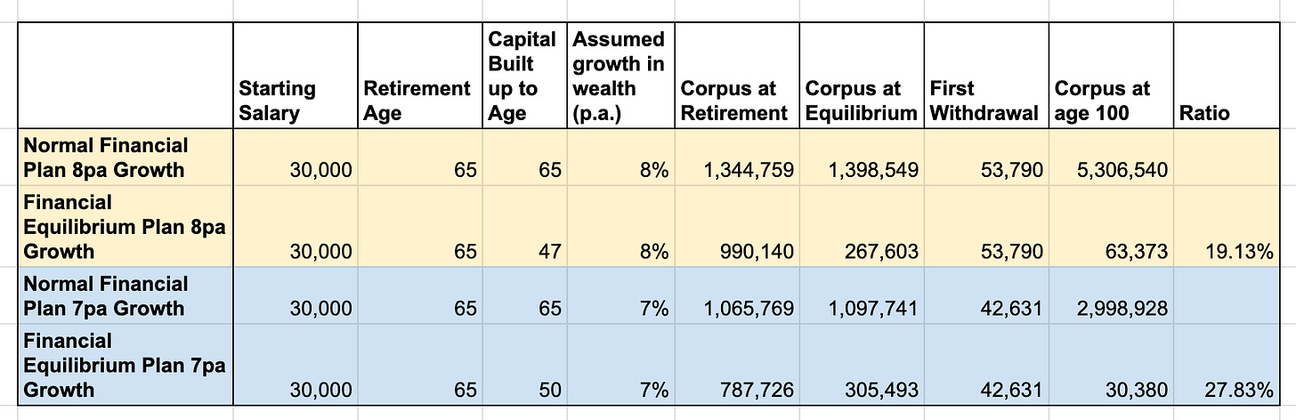 The point at which our exemplar investor stopped investing (ages 47 & 50 in the two growth scenarios) is the point of Financial Equilibrium. Note that in one case, Equilibrium was achieved when less that 1/5th of the desired end-corpus was achieved, and in the second case, just over a 1/4th. Given how low it is to our often desired state of Financial Independence, this should be our first milestone as long term investors.