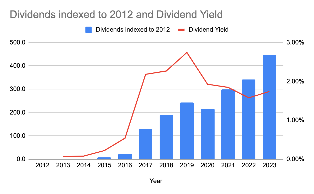 Coming back to dividends and investing, I want to share some personal stories from dividends. Here are my dividends per year, indexed back to 2012: