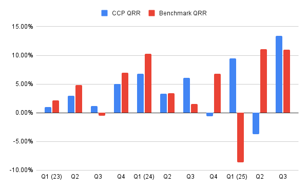 Looking at the quarter-by-quarter chart, the CCP and benchmark move in opposite directions 4 out of 11 times — a hint that returns may be uncorrelated, though I’m not sure what textbook definition of uncorrelated is, given it also has the same direction 7 out of the 11 times. More interestingly however, every time the benchmark surges (say +5% in a quarter), CCP tends to lag, and when the benchmark cools off, CCP catches up — except this past quarter, where CCP outperformed even in a roaring bull market. That’s a first; and hopefully one of many.