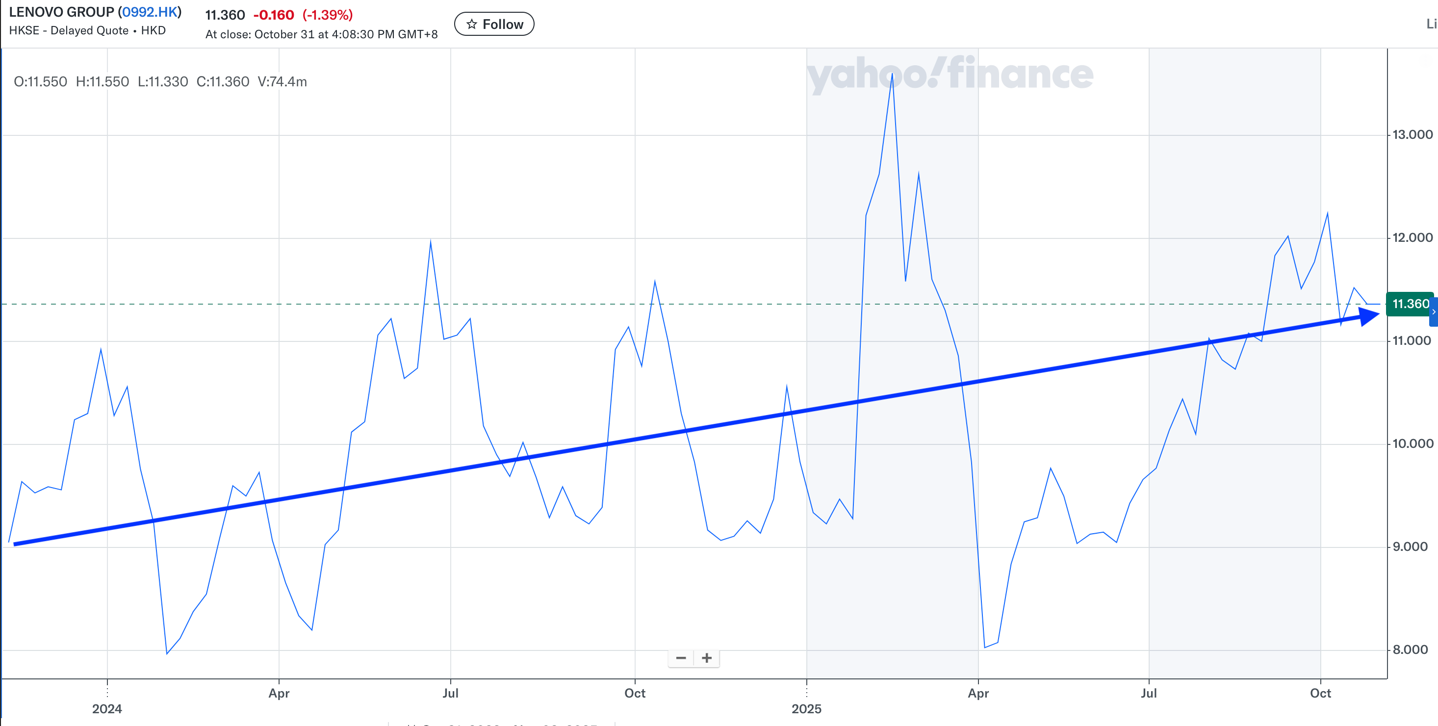 For long-term investors, Lenovo’s stock has been more volatile than its business fundamentals would suggest. The stock has traded in wide ranges over the past two years, often reacting to short-term swings in PC shipment forecasts or macro sentiment around China. Yet, through this noise, the returns have been quietly impressive.