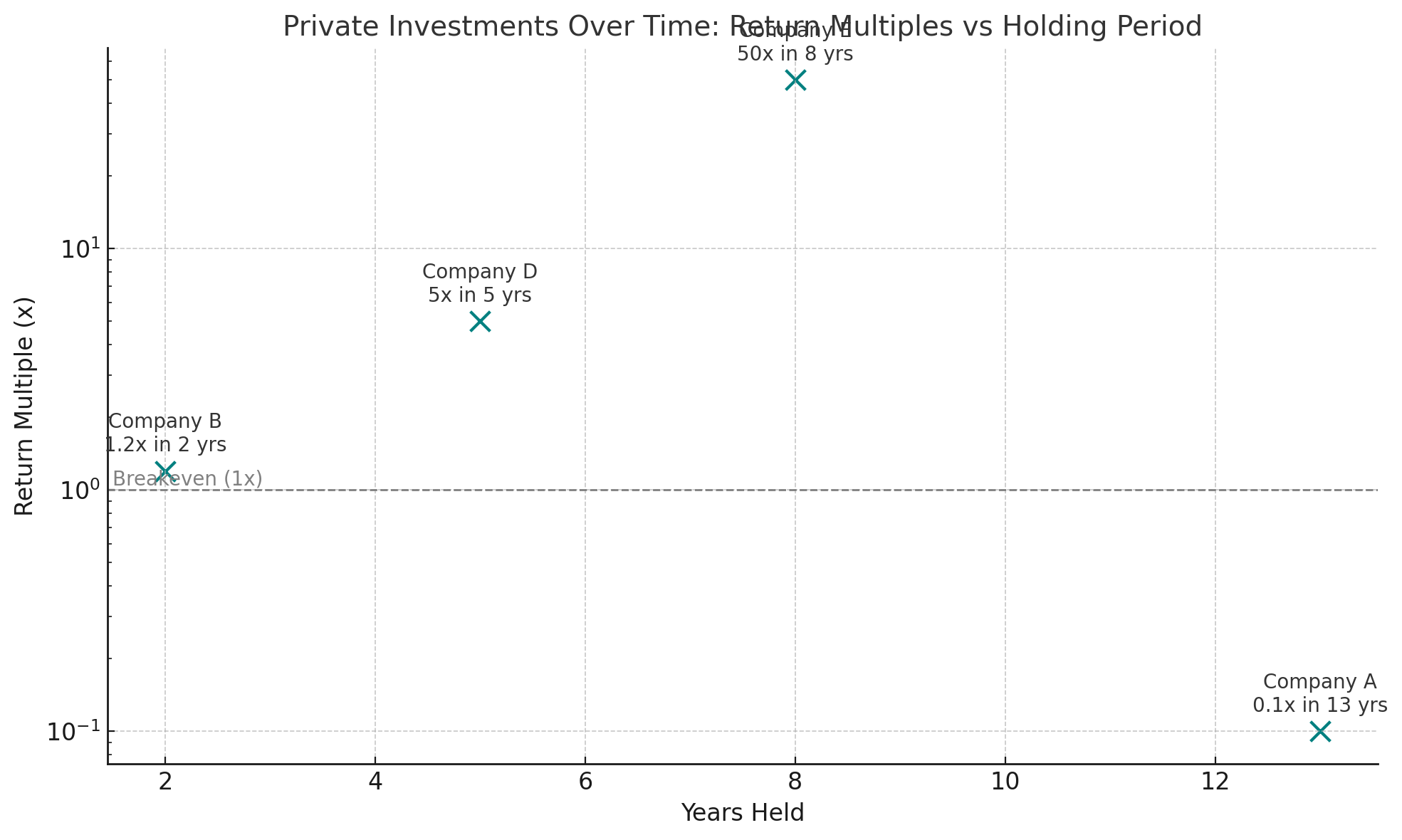 All my past outcomes were acquisitions, but took varying amounts of time and produced wildly different outcomes. One was a total bust. But when you look at the portfolio, not just the individual stories — it becomes clear why asymmetric bets, when taken selectively, can change your trajectory.