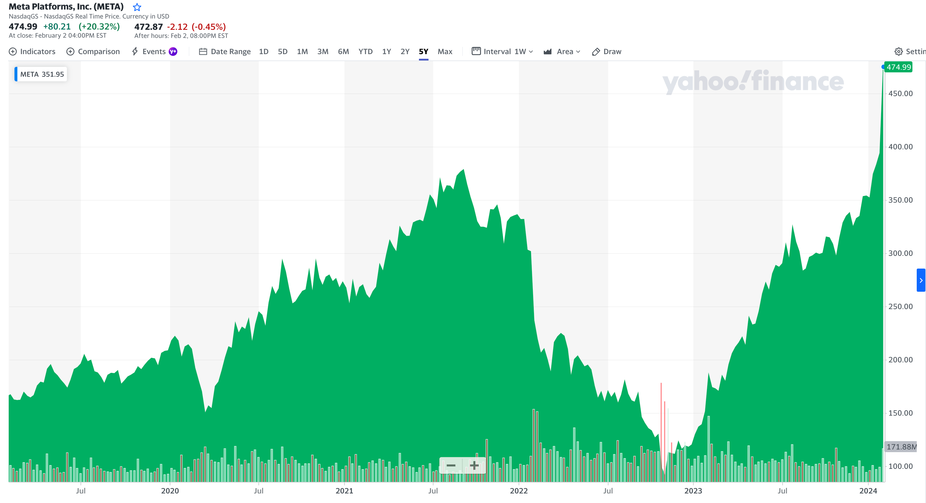 Interestingly, the company only produced a profit of $39.1Bn for 2023, which is lower than the $39.37 from 2021, so the results are not even an all time high for this company, and yet the stock is now about 25% higher than its previous round of all time high, established in Aug 2021, of $380. Against the backdrop of a 5% risk free return todays (vs 1% then), that’s an astonishing story of the stock both on the way down and on the way up - Good for Meta shareholders!