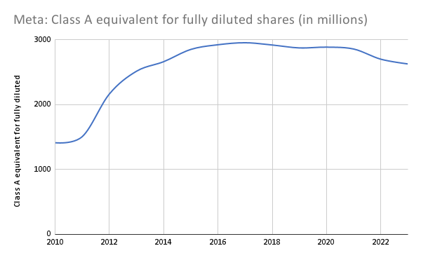 Of the 473Mn shares of net dilution in the 11 yr period, some 213Mn shares went to acquisitions, 201Mn of which went to fund the WhatsApp acquisition in 2014. Instagram was acquired in 2012 - the dilution happened before the time period we are considering (2013-01-01 - 2023-12-31).