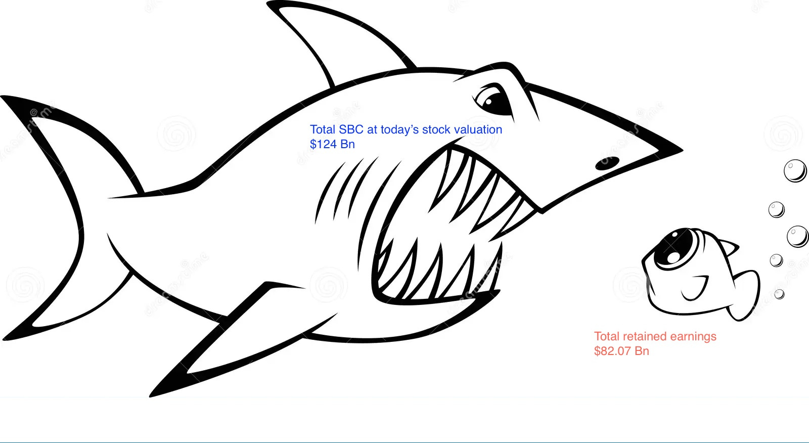 This 262Mn net dilution at today's stock price of $475 is roughly $124Bn in value. This is greater than the retained earnings of company on Dec 31, 2023, some $ 82.07Bn. Put another way, if the company had to dial back its dilution to where it was in 2012, it just can't. It has given out more in stocks than it has retained as earnings in its lifetime of operations, both as private and as a public listed company!