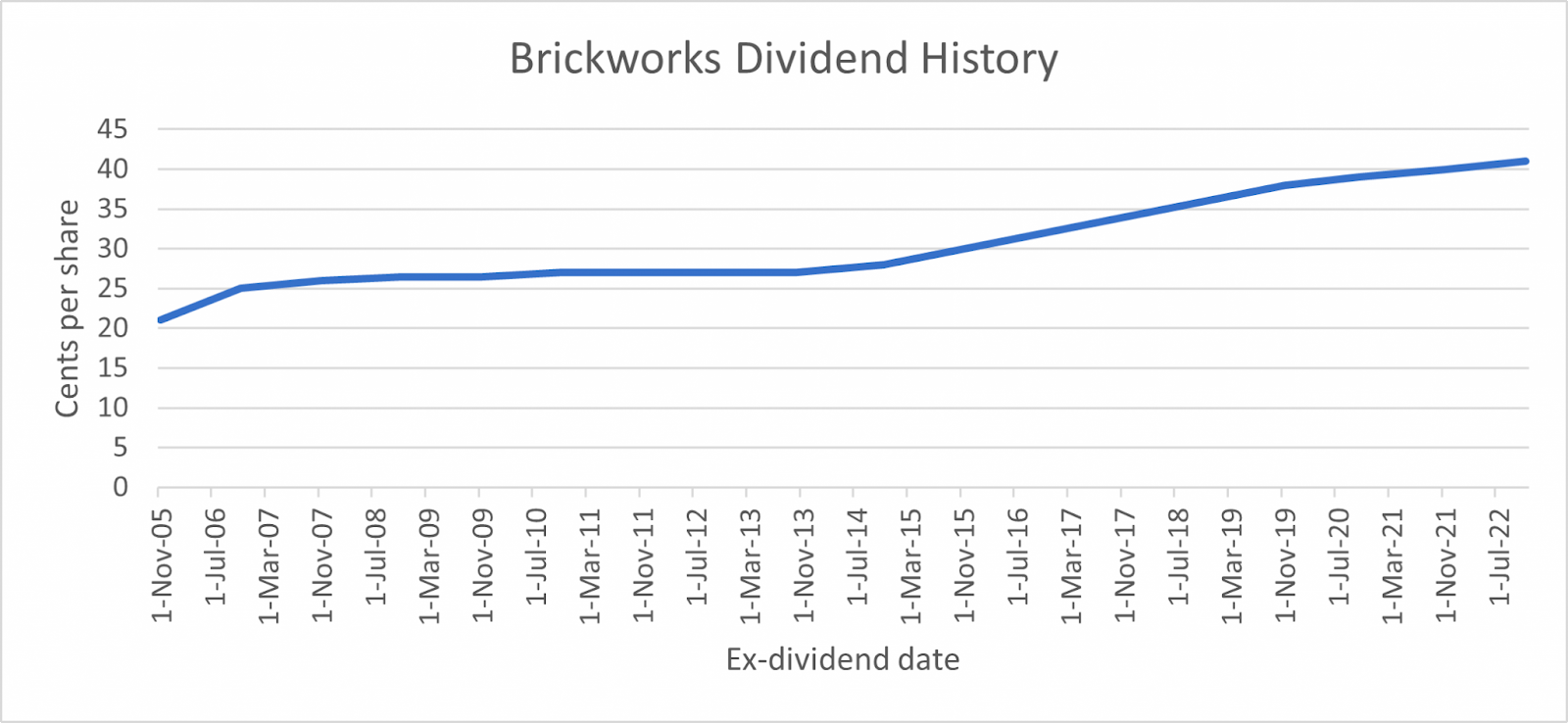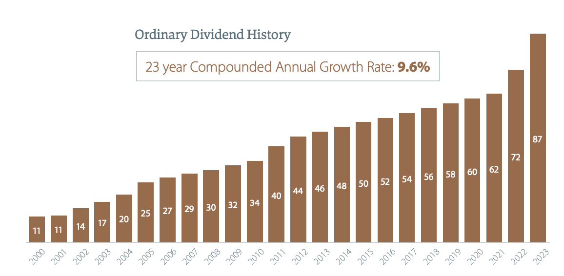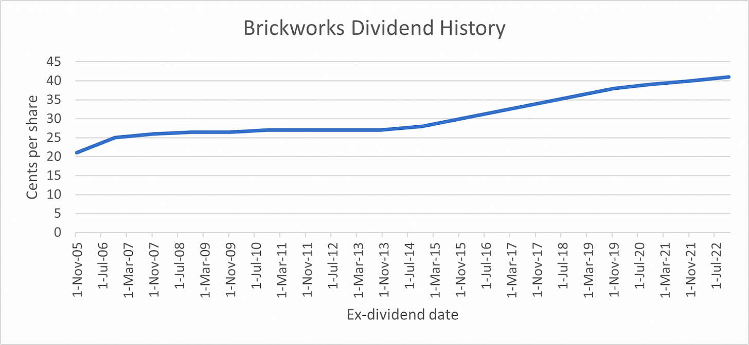 We looked at the consistent dividend track record of WHSp/ASX:SOL, but Brickworks itself is not far behind, having increased its dividend consistently for 15+ years, now returning a fully franked4 $0.65 per share, or about 2.5% yield.