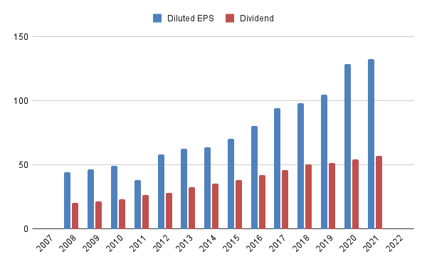 Diluted EPS has been growing at 8.77% during the period, and accordingly, the management has paid back ever increasing dividends, growing at 8.14% during the period. 2023 will be the 30th consecutive year of sustainable dividend growth for the company.